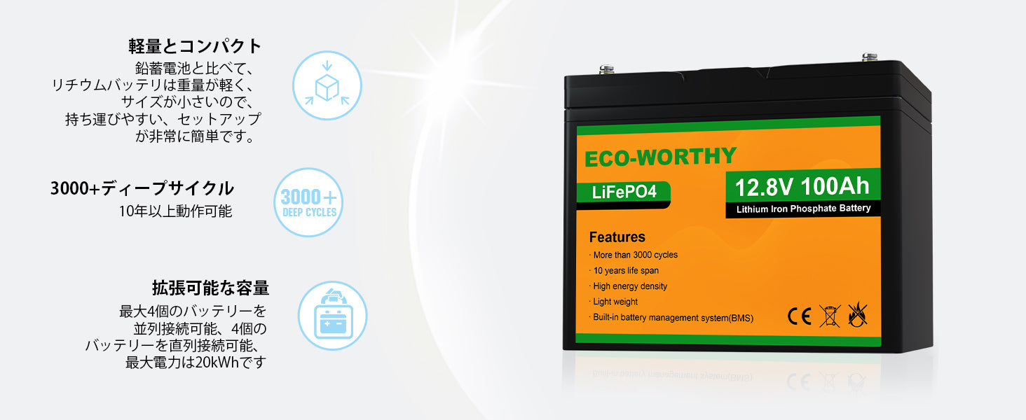 ECO-WORTHY LifePO4リチウムリン酸塩バッテリーの電力の2倍、重量の半分、密閉鉛酸バッテリーの8倍長持ちします。